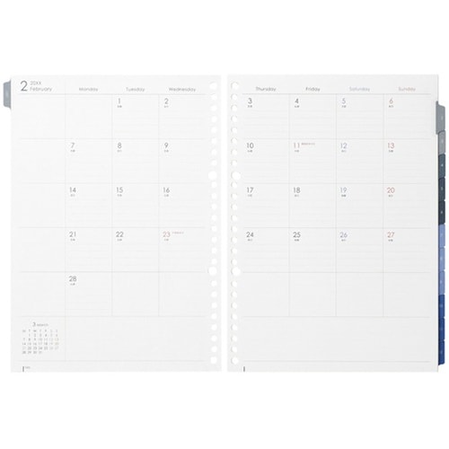 バインダーとの連携でオリジナルダイアリー編集が可能な”ルーズリーフダイアリー”各月の裏が見開きメモとなってます。 |
