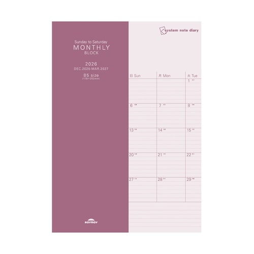 日曜から始まり、1ヶ月全体の予定が把握しやすい。 |