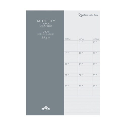 規格サイズ:B6。 | ページ数:96。 | 始まり曜日:月曜日。 | 始まり月:12月。 | 主レイアウト:1ヶ月ブロック(見開き1ヶ月)1週間バー…