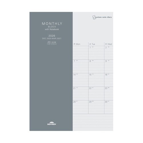 規格サイズ:A5。 | ページ数:96。 | 始まり曜日:月曜日。 | 始まり月:12月。 | 主レイアウト:1ヶ月ブロック(見開き1ヶ月)1週間バー…