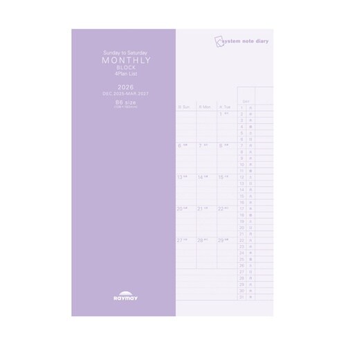 規格サイズ:B6。 | ページ数:40。 | 始まり曜日:日曜日。 | 始まり月:12月。 | 主レイアウト:1ヶ月ブロック1週間バーチカル。 | レ…