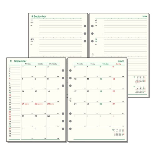 見開き両面1ヶ月&見開き両面1週間・時間目盛付。 |