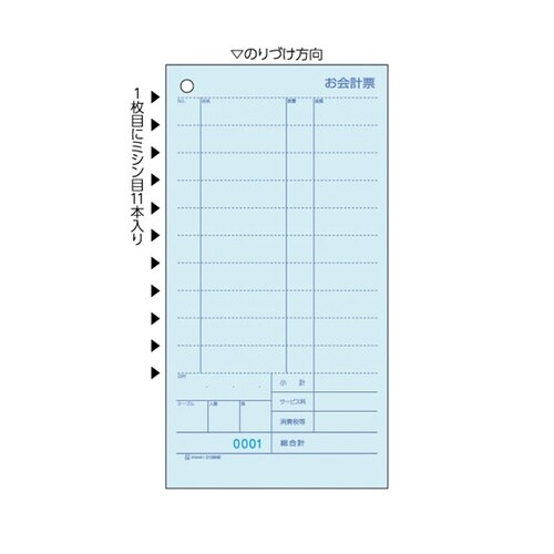 お会計票105×2002Pミシン入(3129)のナンバー入り・大入りタイプです。4ケタナンバー入りです。1枚目にミシン目11本入り。複写のセットごとにのりづけしてあります。 |