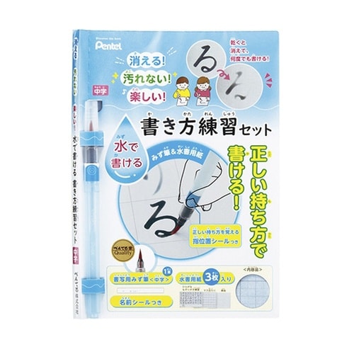 小学校の書写の授業で使用する水書シート専用みず筆と水書用紙のセットです。練習用の水書用紙が3枚入っています。正しい持ち方を覚える指位置シールつき。ぺんてるの筆ペン技術を用いた本格派なみず筆です。 |