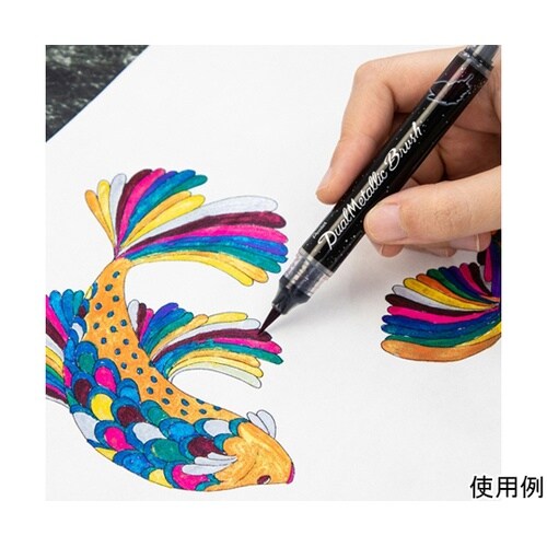 鮮やかな発色の「染料インキ」とたっぷり入った「ラメ顔料」で2種類の色が同時に見えます。毛筆のペン先なので細かい部分から広い面まで自由自在。1本で様々な表情を楽しめます。