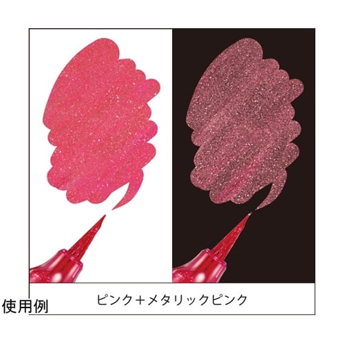 鮮やかな発色の「染料インキ」とたっぷり入った「ラメ顔料」で2種類の色が同時に見えます。毛筆のペン先なので細かい部分から広い面まで自由自在。1本で様々な表情を楽しめます。