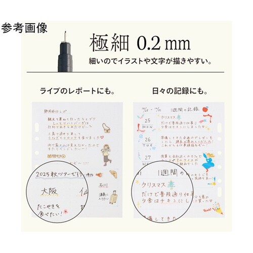 細かいイラストや文字が書ける0.2mmの極細タイプ。線幅0.2mmで細かいイラストや文字が書けるログペンです。