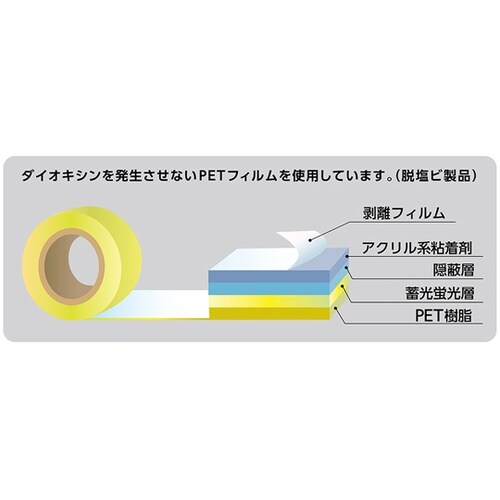 蓄光と蛍光の2つの機能を有しています。太陽光・蛍光灯・白色LEDなどの光を吸収し、暗所で約6ー8時間光ります。ダイオキシンを発生させないPETフィルムを使用しています。 |