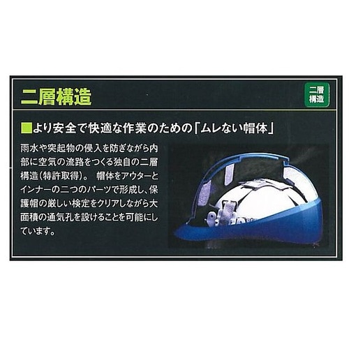 発泡スチロール製の衝撃吸収ライナーがないヘルメットで墜落時保護用の検定を取得。涼しさと安全を両立しました。ヘルメット内部に空間が広がり、格段に通気性が向上します。 |