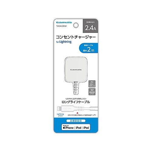Lightningケーブル直結のコンセント充電器。90°回転するACプラグを採用。収納、持ち運びに便利。 |