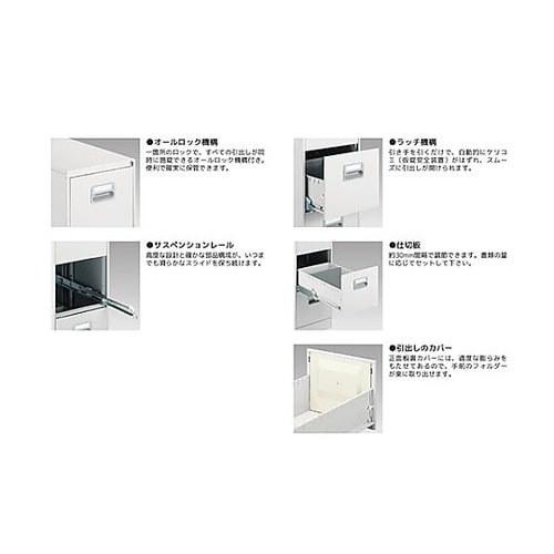 B4サイズ(2段) ファイリングキャビネット情報を系統だてて、分類・保管し、必要な時に手早く検索が可能オールロック機能 一箇所のロックで、すべての引出しが同時に施錠できます。 |