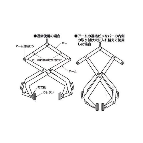 開口幅に関係なく当て板は平行になる構造のため安心です。 石材の厚みにかかわらず確実につかむ事ができます。薄い幅のものから最大開口幅のものまで吊れます。 |