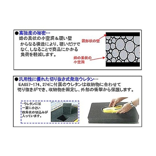 IP65ツル径φ9mm以下の南京錠で施錠可能キャスター付ウレタンあり耐衝撃性樹脂の採用により抜群の商品強度を有します。また、成形一体型のケースは繋ぎ目がなく、強度を増しています。 |