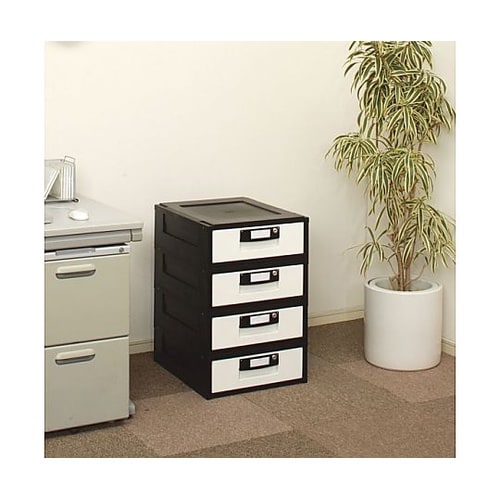 ファイル収納に適した鍵付きオフィスチェストです。引き出しやすい金属レールを採用。天板を付けたまま最大4段までスタッキング可能。 |