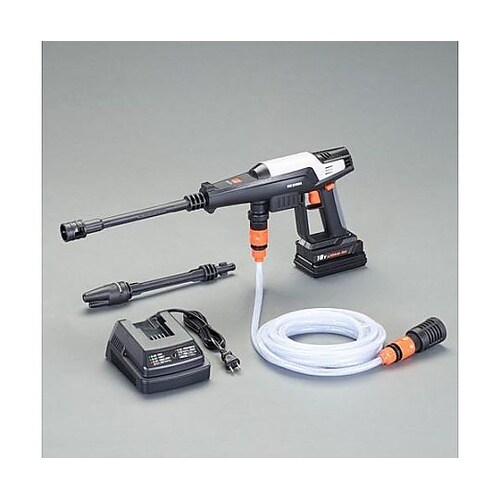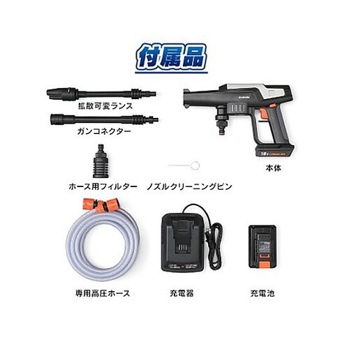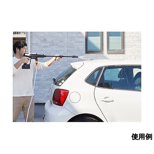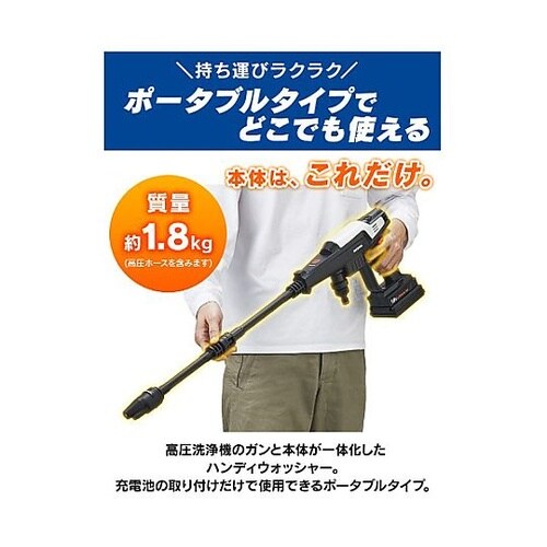 充電池の取り付けだけで使用できるポータブルタイプですガンと本体が一体化したハンディウォッシャーバケツなどに入れた水をくみ上げる吸水タイプで、場所を選ばず使えます。 |