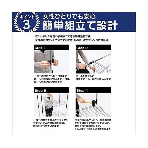 メタルラック用アクセサリー類をお使い頂けます。(適合品のみ)クギやネジを使わず簡単組立棚板の高さは自由に変更可能です。