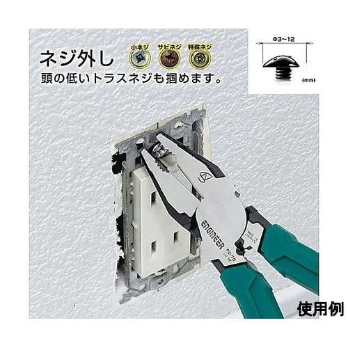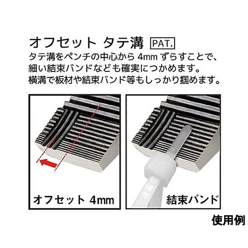 ネジ外し機能を搭載した、電設工事用の多機能ペンチ。今までのタテ溝構造に加えてヨコ溝がプラスされ、ペンチを持つ必要がなくなりました。 |