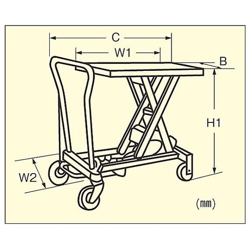 重量物の積み込み・積み降ろしに最適ハンドル折りたたみ式油圧式ハンドルの後に付いているレバーはテーブルを降下させるのに使用します。 |