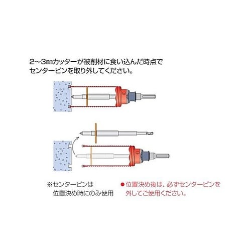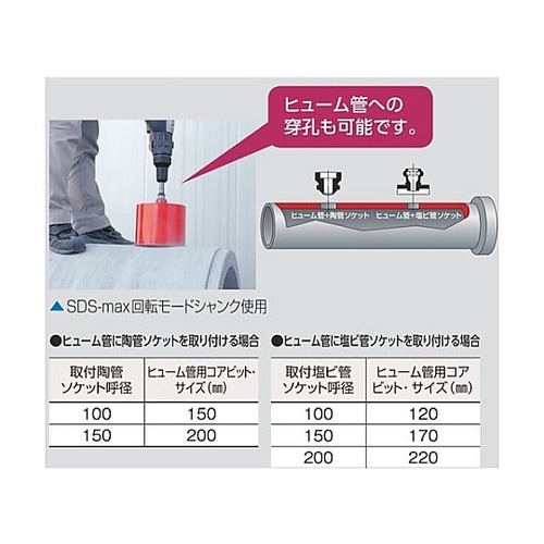 乾式で鉄筋コンクリート・ヒューム管への穴あけが可能に。 (※穴あけ中、急に切れ味が落ちたと感じた場合、又は刃先が変色する等、刃先に異常が生じた場合は、ドレッシングを行ってください。切れ味が戻ります。 |