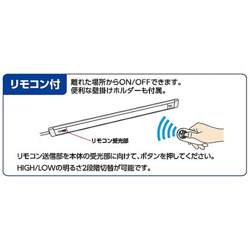 本体リモコン(離れた場所からON/OFFできます。便利な壁掛けホルダーも付属。)HIGH/LOWの明るさ2段階切替可能。付属マグネットホルダーで角度調節可能。3段階に角度を変えることができる。 |