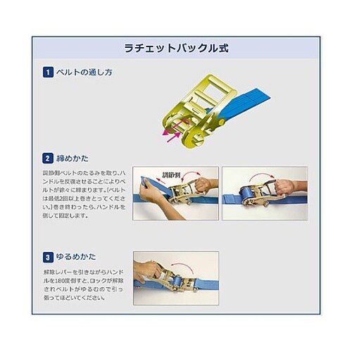 スチールバックル両端アイ型締め付け簡単。しっかり固定。トラックの運搬作業等に活躍。 |