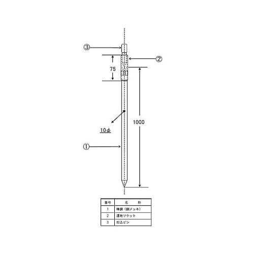 連結式(下部)アース棒十分な強度を備え、打ち込みに適した形状です。単一式(上部)として使用する場合は、リード端子(EA940AS−62/φ10mm用・8mm2×220mm)をご使用ください。 |