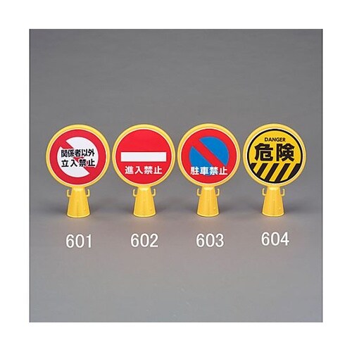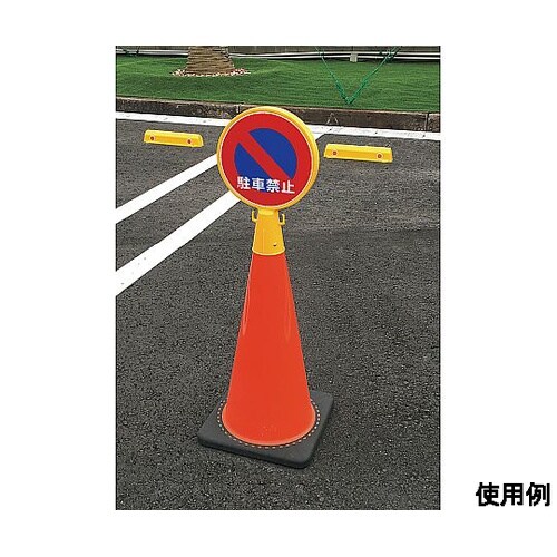 標識とミラーのセットで注意喚起と安全性の確保が両立できます。両サイドにチェーンを掛けるフック付さまざまなコーンに取り付けることができます。コーンは別売です。 |