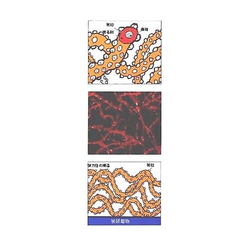 目づまりが少なく、均一な仕上がりにパイプなど曲面部の研磨にも適しています。弾力性に優れているためワークに対するなじみが良く、研削量を容易にコントロールすることができ、削りすぎることがありません。 |
