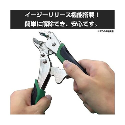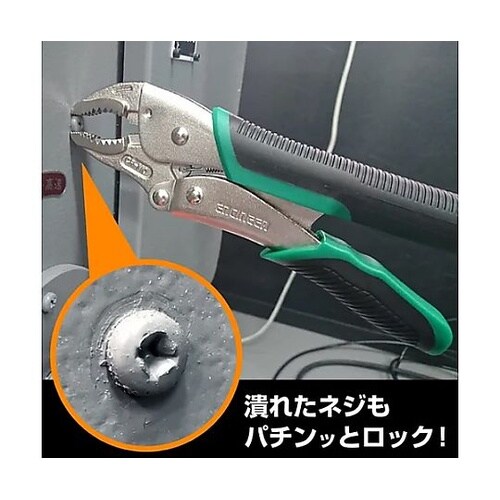 掴んだら離さない、バイス型ネジザウルス。レバー操作なく簡単・安全に解除できるイージーリリース機構採用潰れたネジ、錆びたネジを先端のタテ溝で掴んで回せます。 |