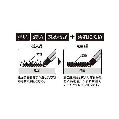 こすれに強くノートをキレイに保つ密着芯デザイン性と機能性を兼ね備えたスライド式ケースで芯が取り出しやすいくっきり濃いのに汚れにくい 独自成分配合により芯粉が紙面に高密着。 |