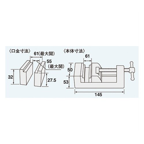 卓上での作業に便利な小型バイス。両サイドおよび背面が直角加工のため、横置きや縦置きでも使用できます。薄板、丸棒、角材などもクランプできる特殊口金付き。口金を裏返すとフラット口金として使用できます。 |