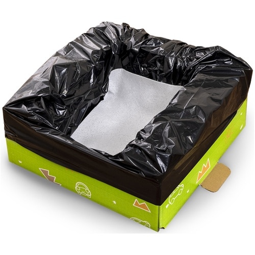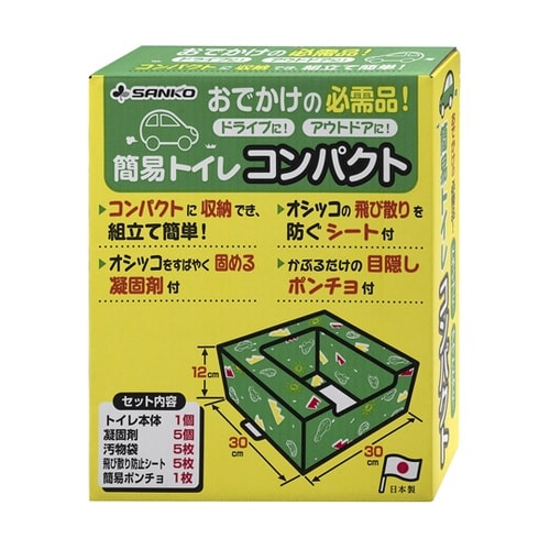 折りたたみ式で持ち運びに便利です。(外装箱を収納箱として使用できます。)凝固剤で水分を固めますので、使用後の水分モレの心配がありません。目隠し用のポンチョ付き。 |