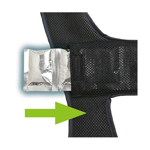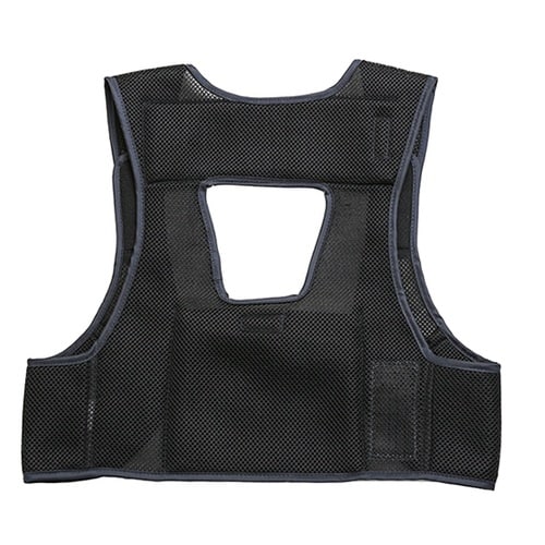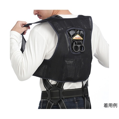 フルハーネス対応、アルミ保冷剤付クールベストです。フルハーネスの上から着用可能です。正面のバックルと肩の面ファスナーでサイズ調節可能です。 |