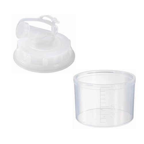 サラヤ製品の5kgボトル、3kgボトル、2kgボトルの口に装着可能です。計量カップは業務用ボトルにノズルをつけたまま上からかぶせることができます。 |