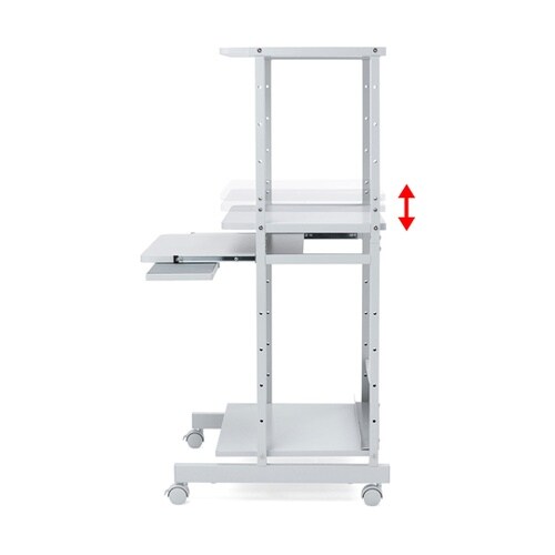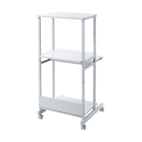 木製天板は環境に優しい再生材を使用しており、スチール製よりも優しい手触りです。全体の高さを抑えた省スペースラックです。スライド式キーボード棚とマウステーブル付きです。 |
