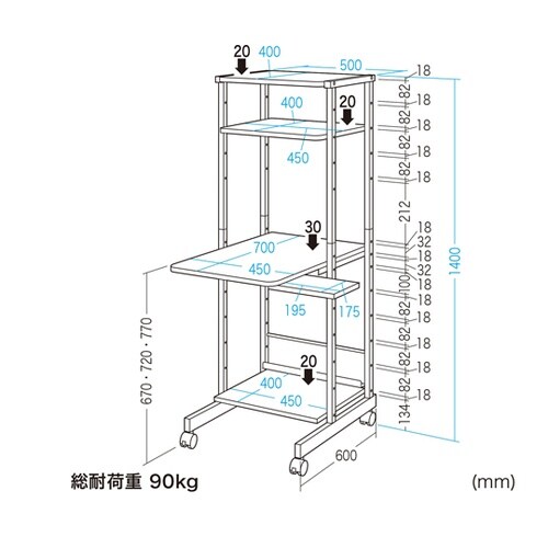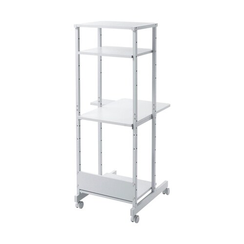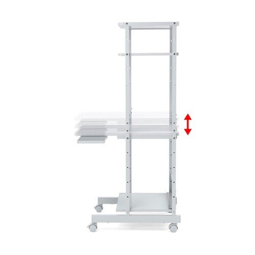 木製天板は環境に優しい再生材を使用しており、スチール製よりも優しい手触りです。幅500mmの超省スペース型ラックです。メイン天板の位置を3段階で変更することができます。 |