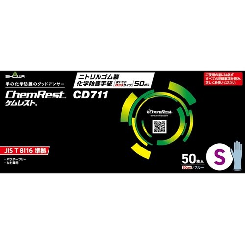 ニトリルゴム製化学防護手袋 使いきりロングタイプ S ブルー 1ケース(50枚×20箱入) CD711−S(1ケース) 1ケース