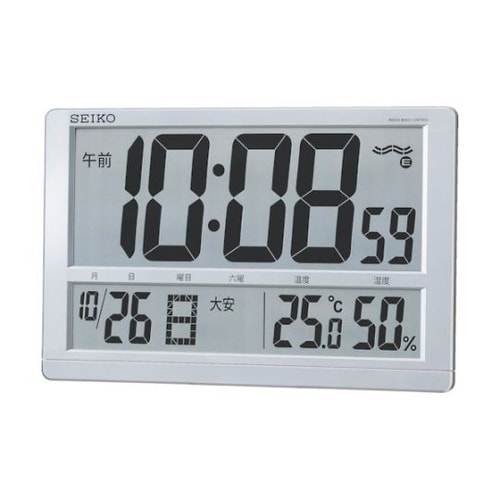 掛置兼用の大型電波時計です。電波修正機能(40kHz/60kHz自動選局・受信OFF機能)付です。2099年までのフルオートカレンダー機能付です。温湿度表示機能付です。 |