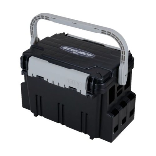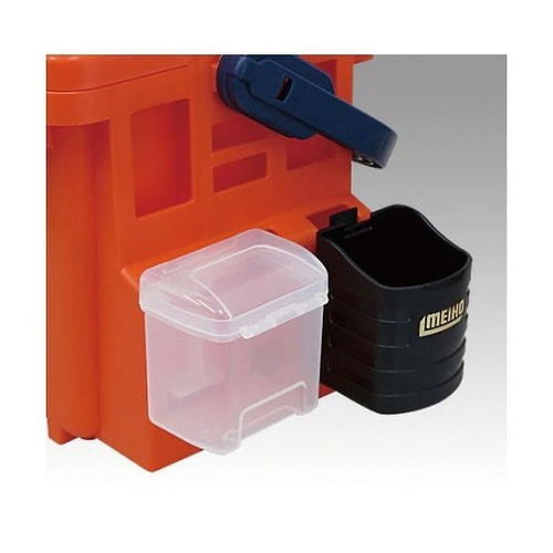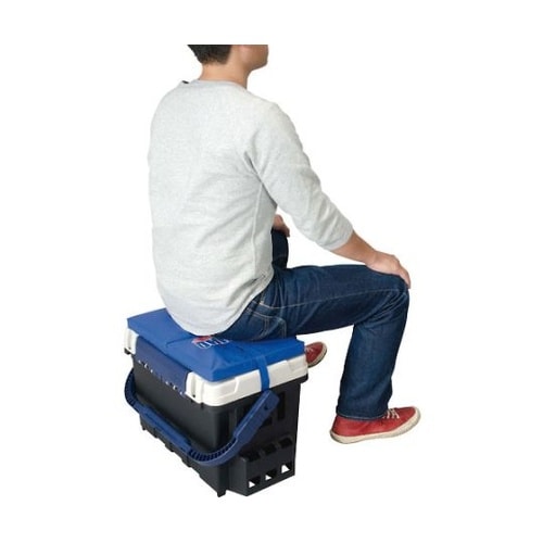 座れる収納ボックスです。両開きのフタは開けたまま90度で止まります。安定感のある大型ハンドルを採用しています。水しぶきなどが侵入しにくいです。別売のパーツケースBM−100を取り付けできます。 |