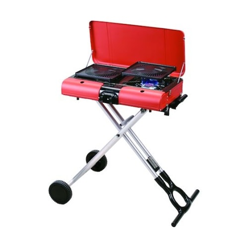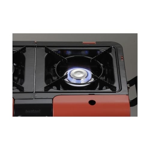 着脱可能なスタンドで、スタンド型とテーブル置きの2通り使用可能です。テーブル直置き可能です。2口のカセットボンベ式バーナーを採用しています。カセットコンロと同様の安全装置を採用しています。 |