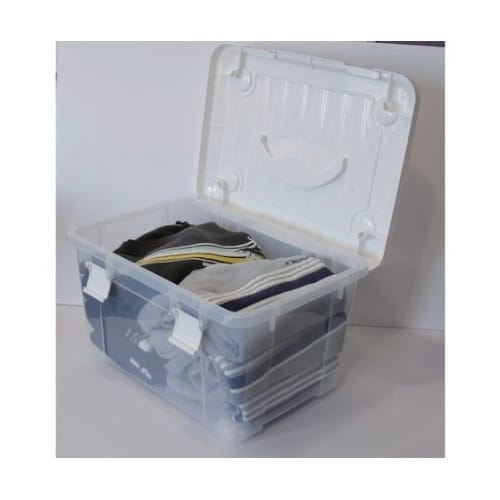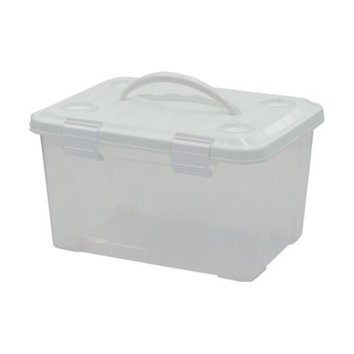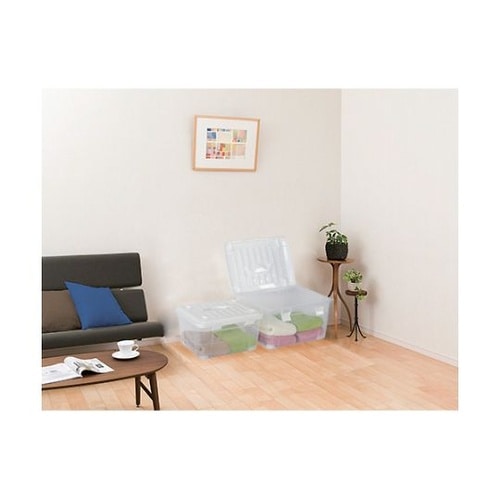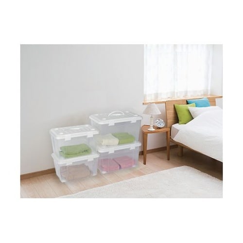 中身が一目でわかるクリアタイプです。フタにハンドルが付いているので、キャビネットから取り出したり、持ち運びする時に、とても便利です。フタは片側開きなので、フタを付けたまま収納できます。 |