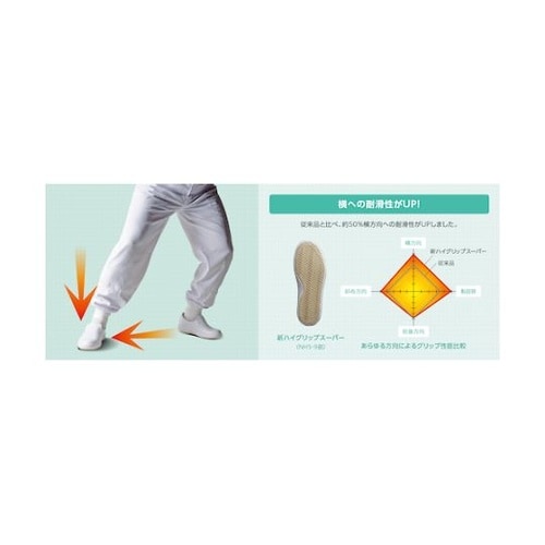 靴底パターンを斜めに配置し、前後だけでなく横・斜め方向へのグリップ力を強化しました。グレーチングのような硬い金属面や凹凸のあるタイルなど、様々な床材で耐滑性能を発揮します。 |