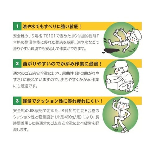 JIS付加的性能「F」合格の超耐滑ゴム底により、油や水など滑りやすい環境でも安心して作業が出来ます。屈曲性に優れており、歩きやすくかがみ作業にも最適です。