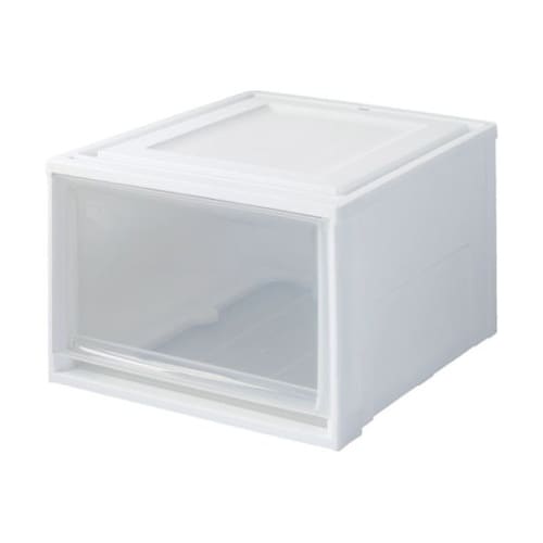 あったら便利なオールマイティーサイズの収納ケースです。透明な引出しで、外側から収納物が確認できます。前倒し防止構造で、積み重ねても使いやすい仕様です。スペースを広げず収納力がアップしています。