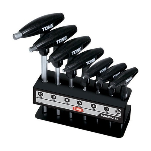 フィット感抜群のT形樹脂グリップです。グリップ部にはすべり止め処理を施しています。5ー10mmサイズにはグリップの端に同サイズの六角棒を設置しています。六角穴付ボルト・ねじの締付け・緩め作業用。 |
