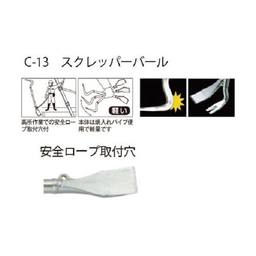 高所作業の安全ロープ用穴付です。頭部はハンマーで叩きやすい形状になっており、ハガシ作業で壁際の隙間などにハンマーで頭部を叩き込んで使用できます。 |