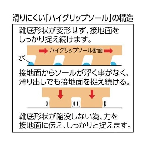 油や水など滑りやすい床面での作業に適した滑りにくい靴底です。銀などの無機系抗菌剤を練り込んでいますので、半永久的に抗菌効果が持続します。異物などが目詰まりしにくい靴底です。