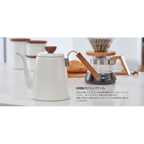 注ぎ口の細いドリップケトルはお湯の量やスピードがコントロールしやすく、おいしいコーヒーを淹れるのに役立ちます。琺瑯と天然木との組み合わせによるナチュラルな雰囲気をお愉しみいただけます。 |