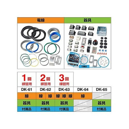 第一種電気工事士技能試験の候補問題全10問を1回ずつ練習できる電線・器具が入組みされています。 |
