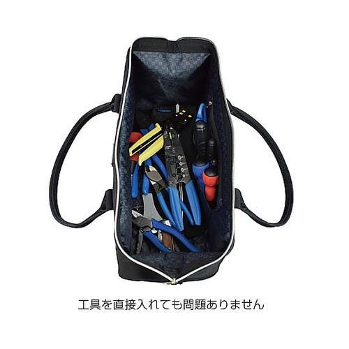 広い開口部で荷物を取り出しやすいボストンタイプのツールバッグ出張メンテナンスなどで必要な工具を持ち運ぶのに便利なボストンタイプ。 |